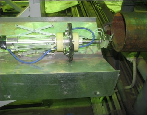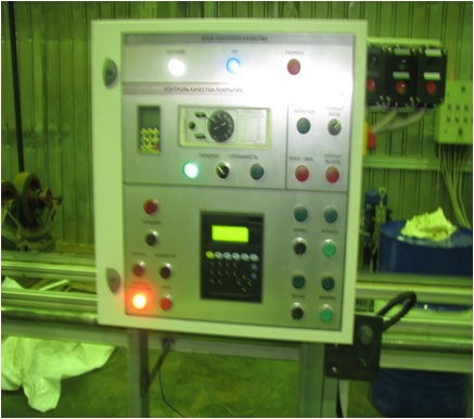 Дефектоскоп работает следующим образом: электрод, на который подается высокое напряжение, перемещается штангой вдоль оси трубы. В местах непрокраса или недостаточной толщины покрытия возникает электрический пробой напряжения на заземленный металл трубы. Пробой фиксируется и отображается на пульте управления.